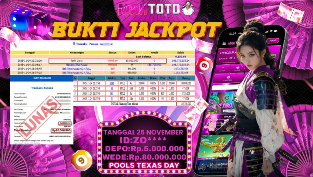 Selamat kepada User id : ZO*** Telah berhasil mendapatkan kemenangan besar pada permainan TOGEL POOL TOTO MACAU kemenangan Sebesar Rp.80.000.000, Setelah mengisi formulir withdraw dengan kurung waktu hanya 5 – 10 menit pihak maktoto sudah melakukan transfer kepada pemilik Userid dan dana sudah dapat di cairkan oleh pemenang. Bukti pembayaran yang kami berikan merupakan bukti pembayaran yang SAH / VALID yang langung di dapatkan melaui tanda transfer transaksi dari Bank yang di tuju.